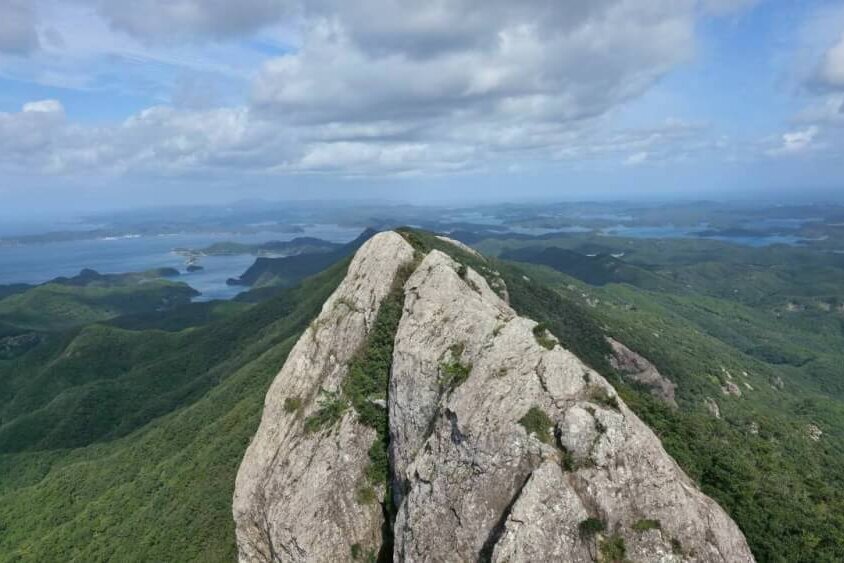 そして山頂に着くと、ついさっきカヤックで漕いでいた浅茅湾が一望できました。