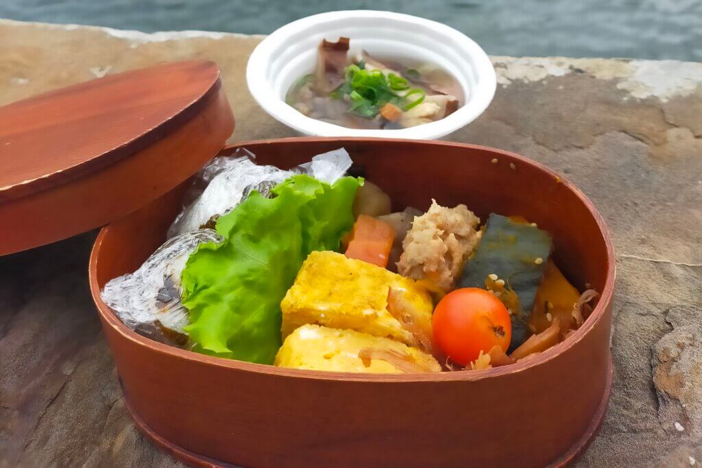 湾に着くと、カヤックガイドさんが美味しい手作り弁当と、地元の「ろくべえ汁」を用意してくれました。(さつまいも粉のもちもち麺を、鶏や野菜の出汁で煮込んだ対馬の素朴な郷土料理です。)