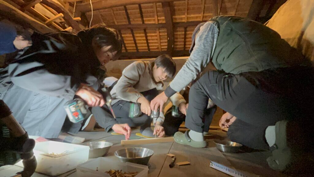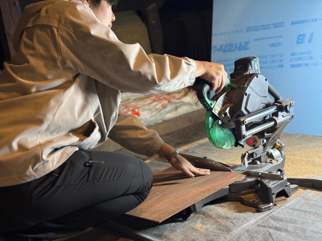 学生たちは、ものの数分で釘打ちや丸ノコの操作の仕方、床張りの技術を学び「磯のや」の屋根裏部屋の修復再生に貢献することができました。
