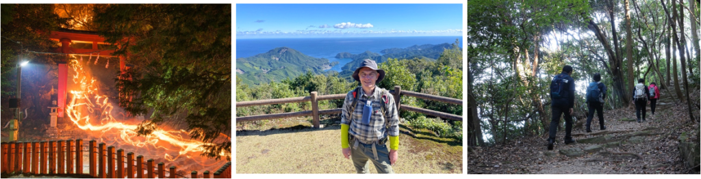 「下り竜」と呼ばれる様子(左)。御燈祭にも参加するTim氏(中央)。世界遺産・熊野古道 高野坂トレイル(右)