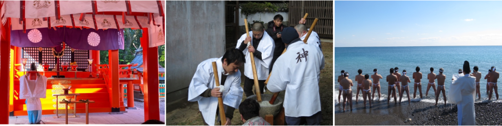 世界遺産・熊野速玉大社での正式参拝(左)。【特別見学】特殊神饌「かがり御供」奉製(中央)。禊の様子(右)