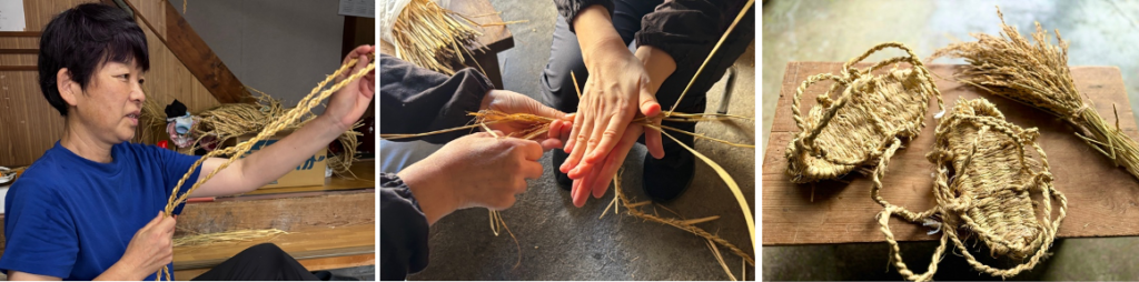 神事を支える女性のわらじ職人 (左)。神事に参加する人々の足元を守るわらじ(中央・右)