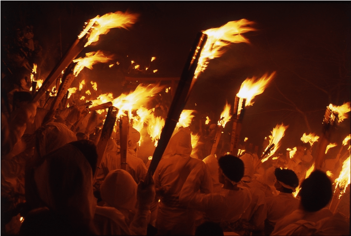 黄昏とともに始まる神事(左)(中央)。新宮に春をもたらす神の火(右)