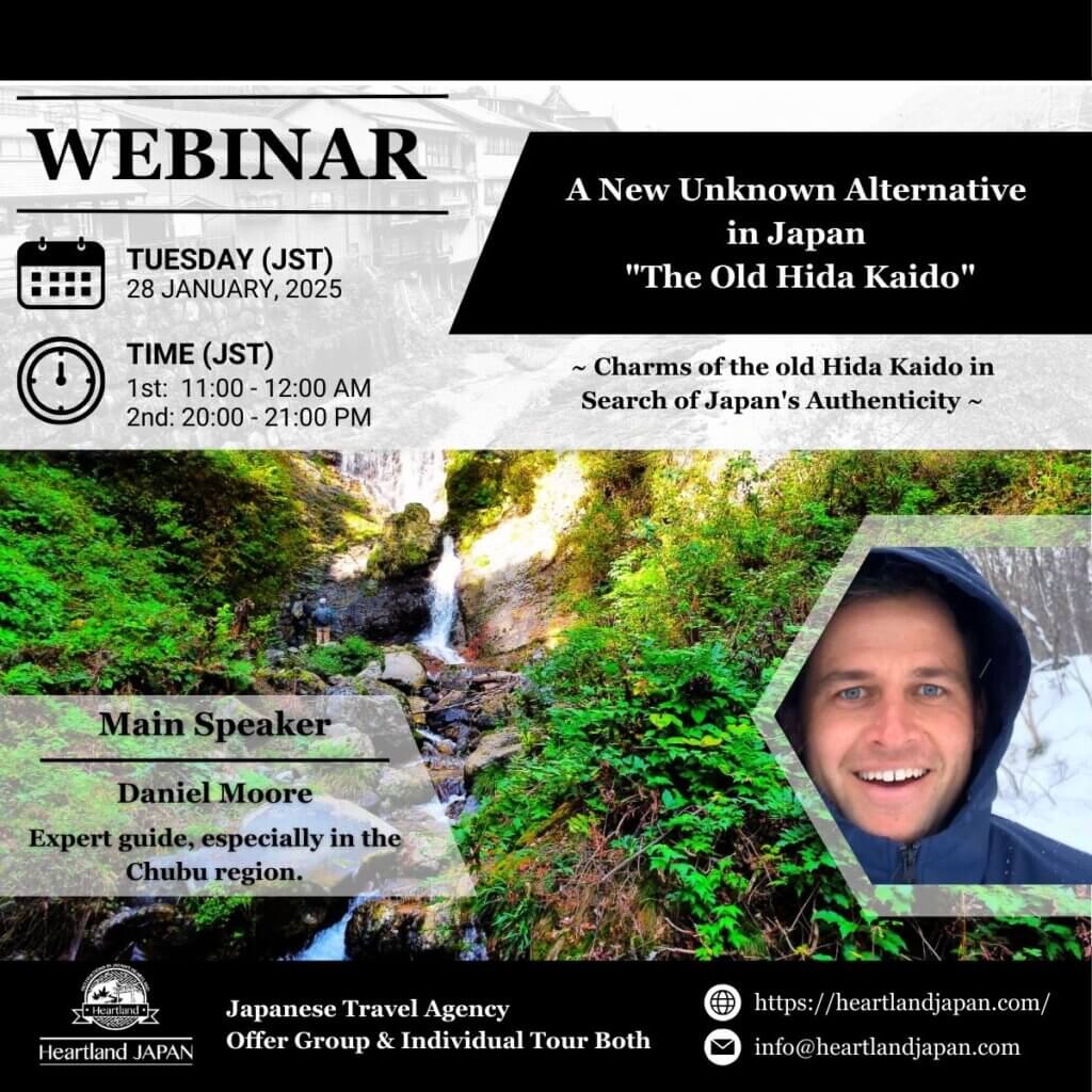 今回のウェビナーでは、弊社のガイドでもあり、中部地方のガイドのエキスパートとして活躍するダニエル・ムーア氏が登壇し、旧飛騨街道の魅力について詳しく紹介しました。