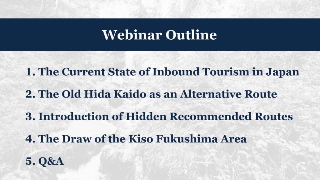 本ウェビナーは、海外旅行代理店の皆さまに日本旅行商品の新たな選択肢として旧飛騨街道を紹介し、特にオーバーツーリズムの課題に対する解決策としての可能性を探ることを目的としました。